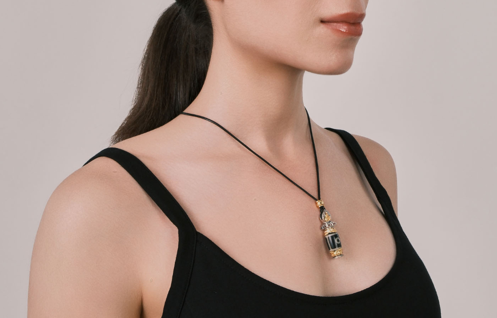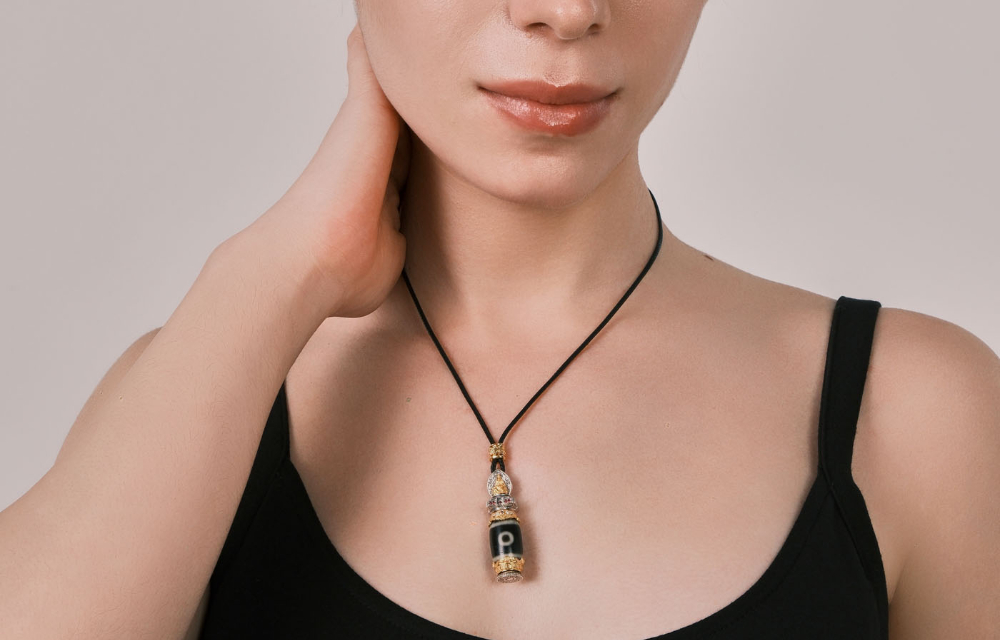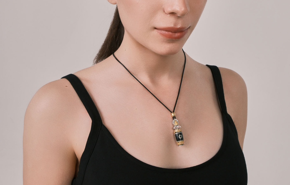 The "Di Men Two-Eye" pattern is a special energy totem, symbolizing a solid foundation and the accumulation of resources. It carries the powerful meaning of unlocking the treasure within, blessing you with smoothness in life and career. Inspired by the layered elegance of sacred buildings, the pendant features multi-level relief carvings—from the sun-moon deity motifs to the dzi bead base and edge decorations—creating a three-dimensional texture that showcases exquisite craftsmanship.