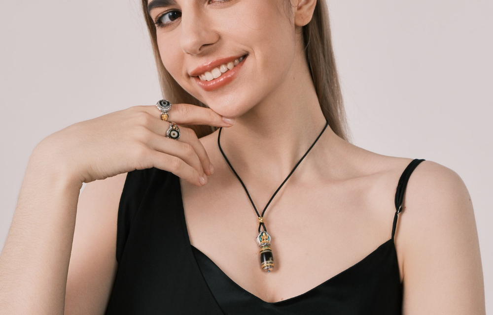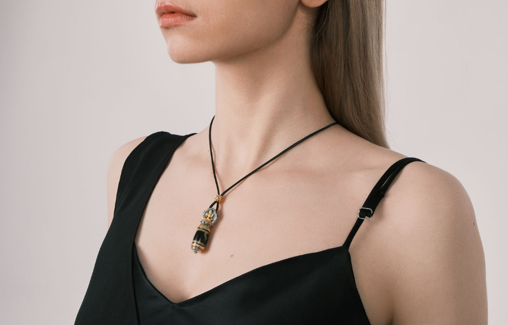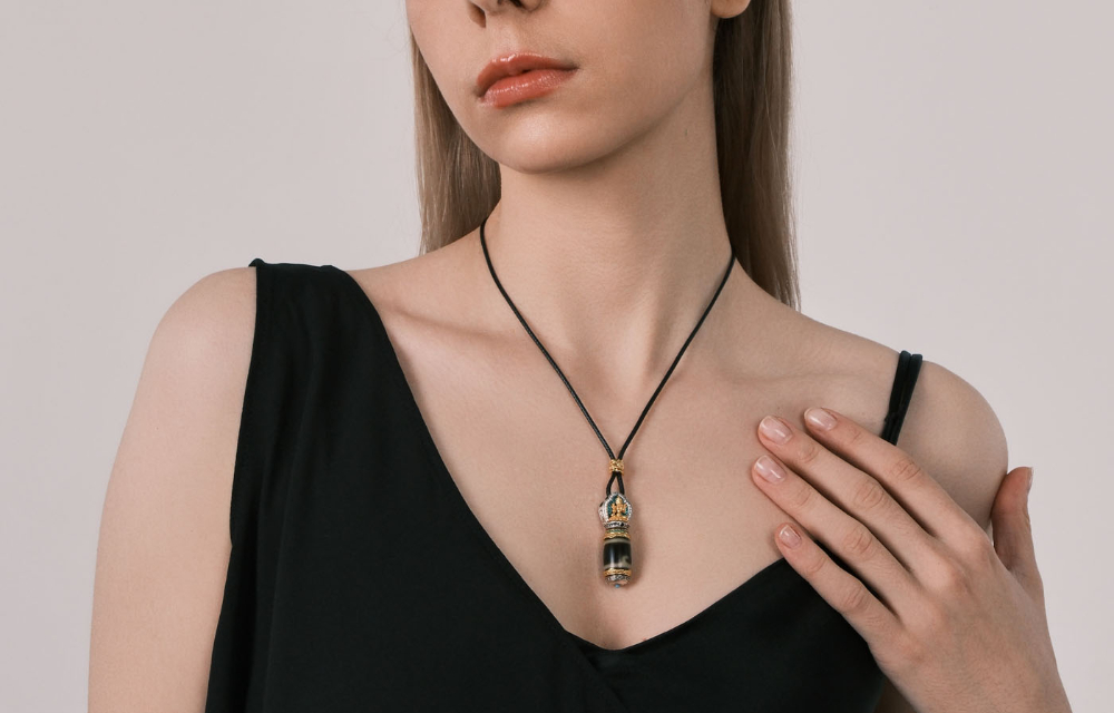 The main body of the dzi bead is engraved with the sacred symbol of Green Tara — the Tibetan goddess of compassion and liberation, whose power forms a cycling blessing as the bead rotates. It symbolizes the endless flow of life and the promise that hardships will eventually yield to joy. Adorned with a holy lotus and guardian deity at the top, it doubles as a symbol of pure and positive energy, creating a spiritual shield for the wearer. Every gentle spin is a conversation with your inner strength, as Green Tara’s protective energy integrates into daily life, helping you dispel negativity and face challenges with resilience.